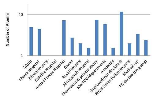 After fulfilling the pharmacy licensing requirements, there are various opportunities in both government and private sectors to adsorb our pharmacy graduates into the Omani market as illustrated in the graph below. This is including all government hospital (hospital and clinical pharmacists), government and private polyclinics (pharmacists), community pharmacies and medical representatives. In some cases our alumni have decided to continue their postgraduate studies to progress further in their career development plans.