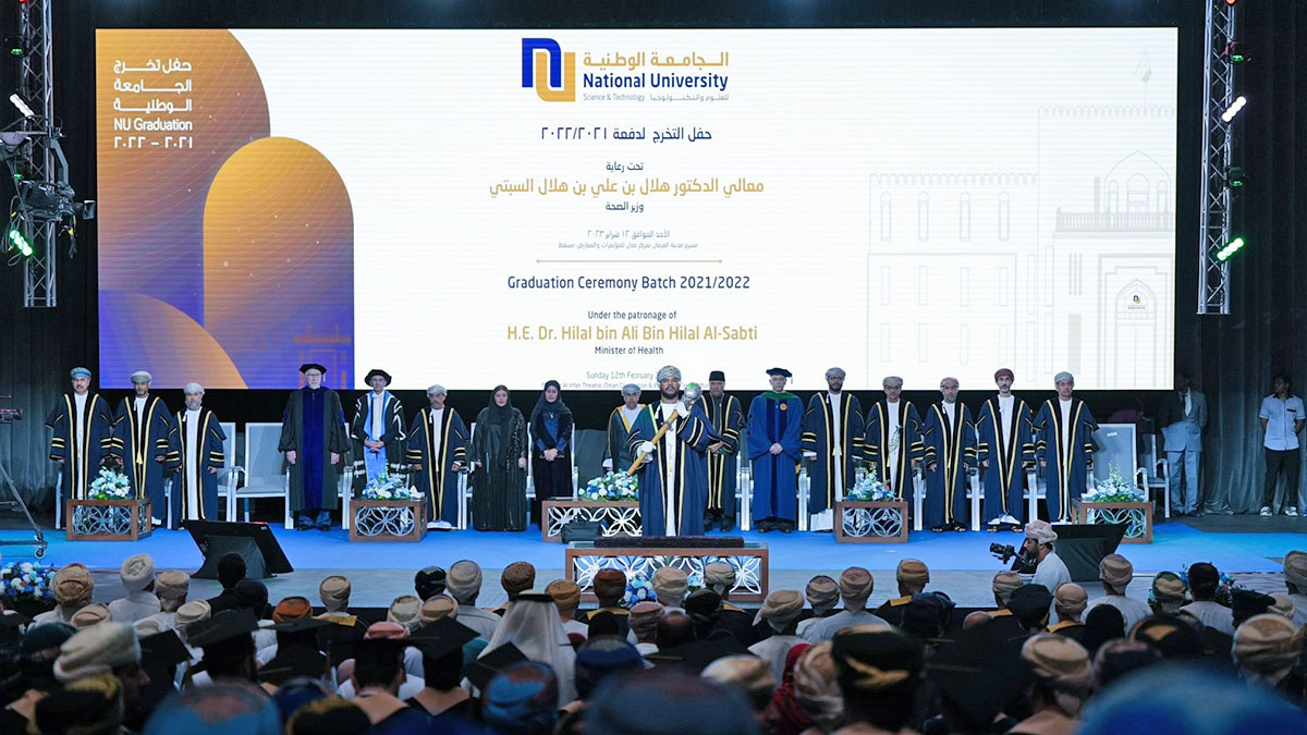 احتفلت الجامعة الوطنية للعلوم والتكنولوجيا بتخريج 1215 خريجًا وخريجة لدفعة 2021-2022، وذلك في يوم الأحد الموافق 12 فبراير 2023 ،حيث أقيم حفل التخرج في مسرح مدينة العرفان بمركز عٌمان للمعارض والمؤتمرات في محافظة مسقط ؛ رعى حفل التخرج معالي الدكتور هلال بن علي السبتي وزير الصحة.