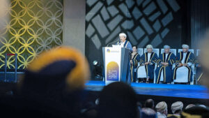 بدأ الحفل بالسلام السلطاني ثم تلاوة مباركة من آيات الذكر الحكيم بعدها القى الدكتور بي محمد علي رئيس مجلس إدارة الجامعة كلمة ترحيبية ، وهنأ أولياء أمور الطلبة والجهات الراعية ، وحث الخريجين على مواصلة التعلم وتطوير أنفسهم ليكون لهم دورا فاعلا في المجتمع.