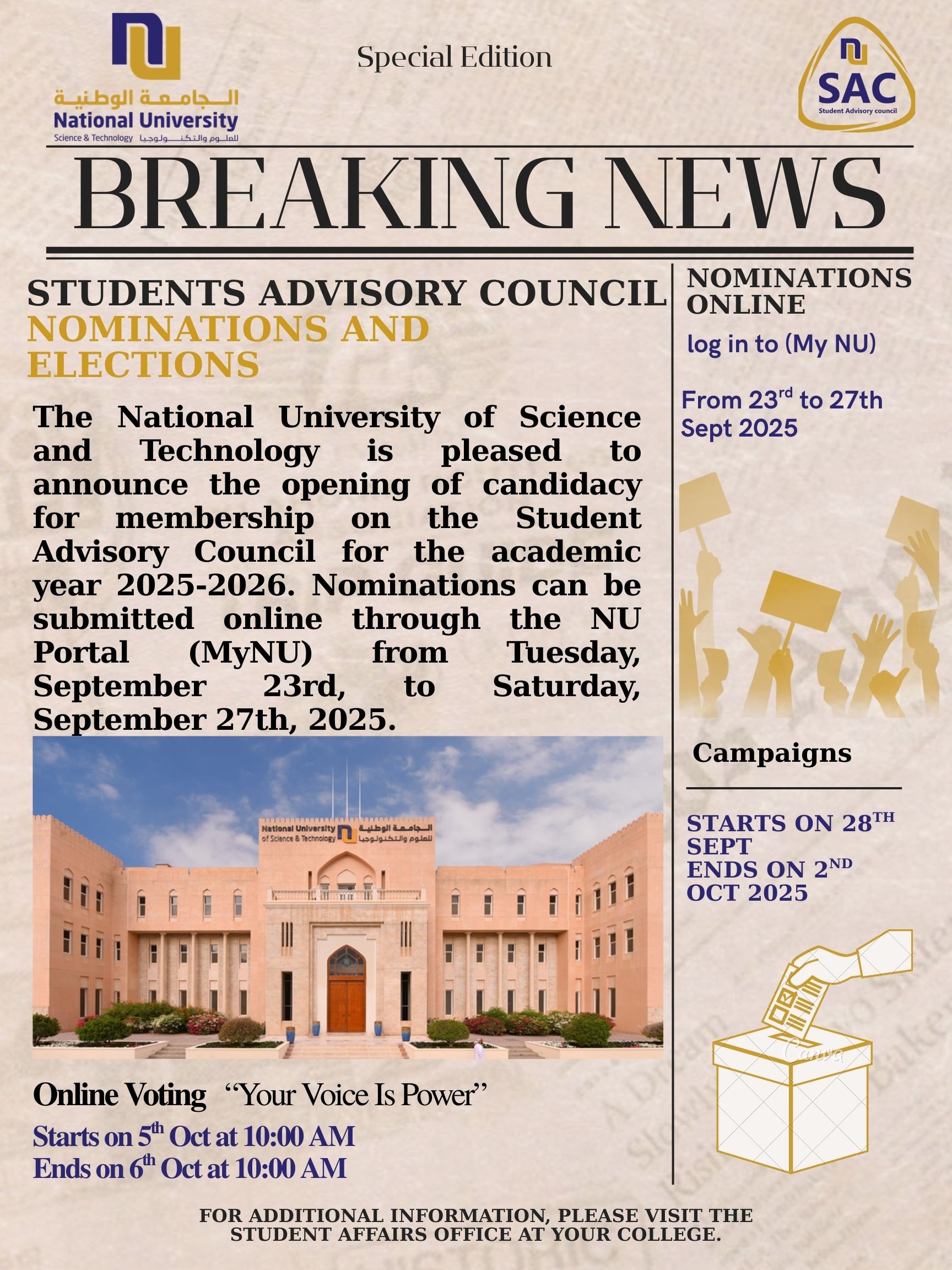 The National University of Science and Technology is pleased to announce the opening of candidacy for membership on the Student Advisory Council for the academic year 2025-2026. Nominations can be submitted online through the NU Portal (MyNU) from Tuesday, September 23rd, to Saturday, September 27th, 2025.