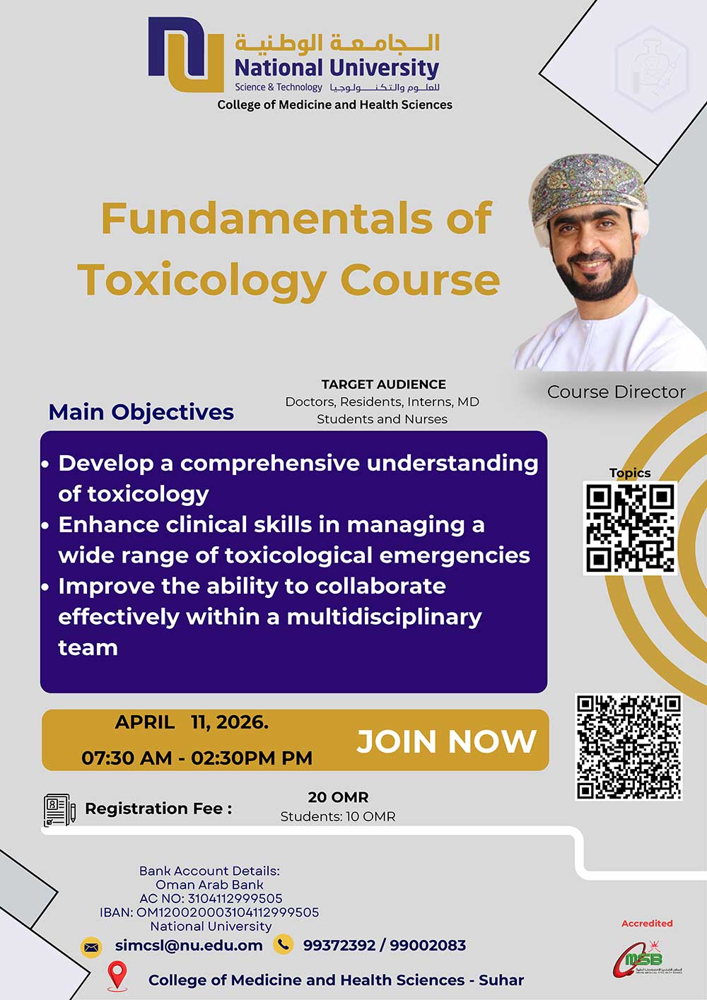 This short intensive course will help participants develop a strong understanding of toxicology principles, enhance clinical decision-making in poisoning cases, and strengthen collaboration within multidisciplinary healthcare teams.