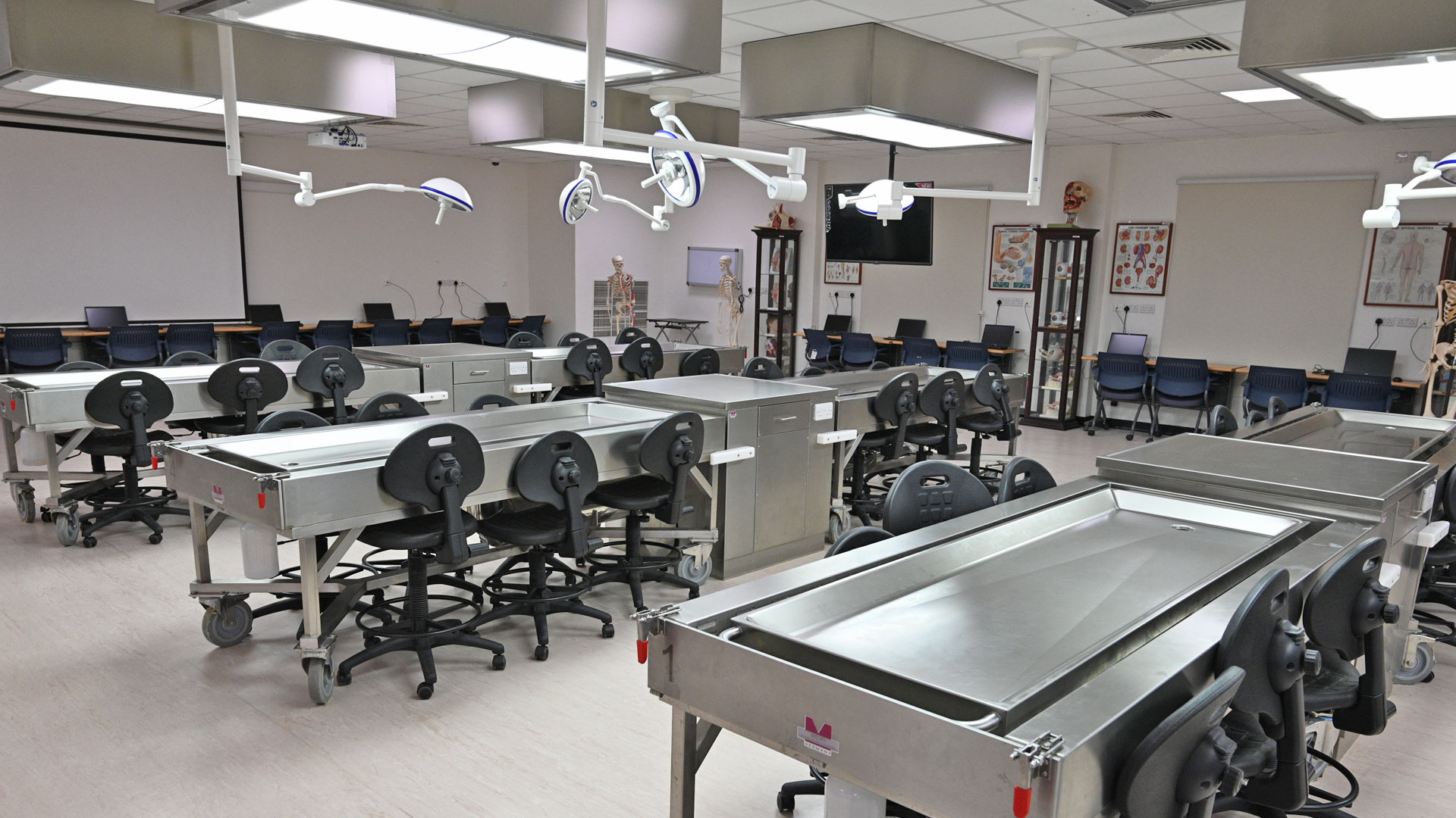The main table in the center is equipped with a high-resolution video camera attached to 8 LED TV screens. This technological enhancement aids in engaging students in the teaching and learning process. The facility enables the instructors to give live demonstration on cadavers to all the students at the same time with the elements of active learning embedded during instructional delivery.
