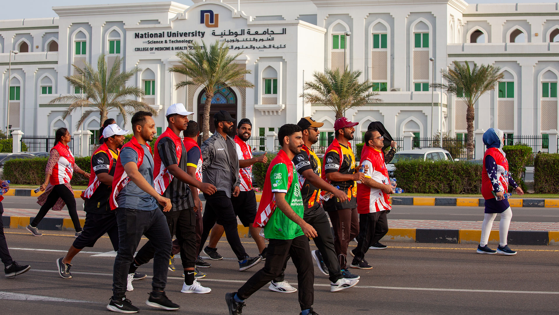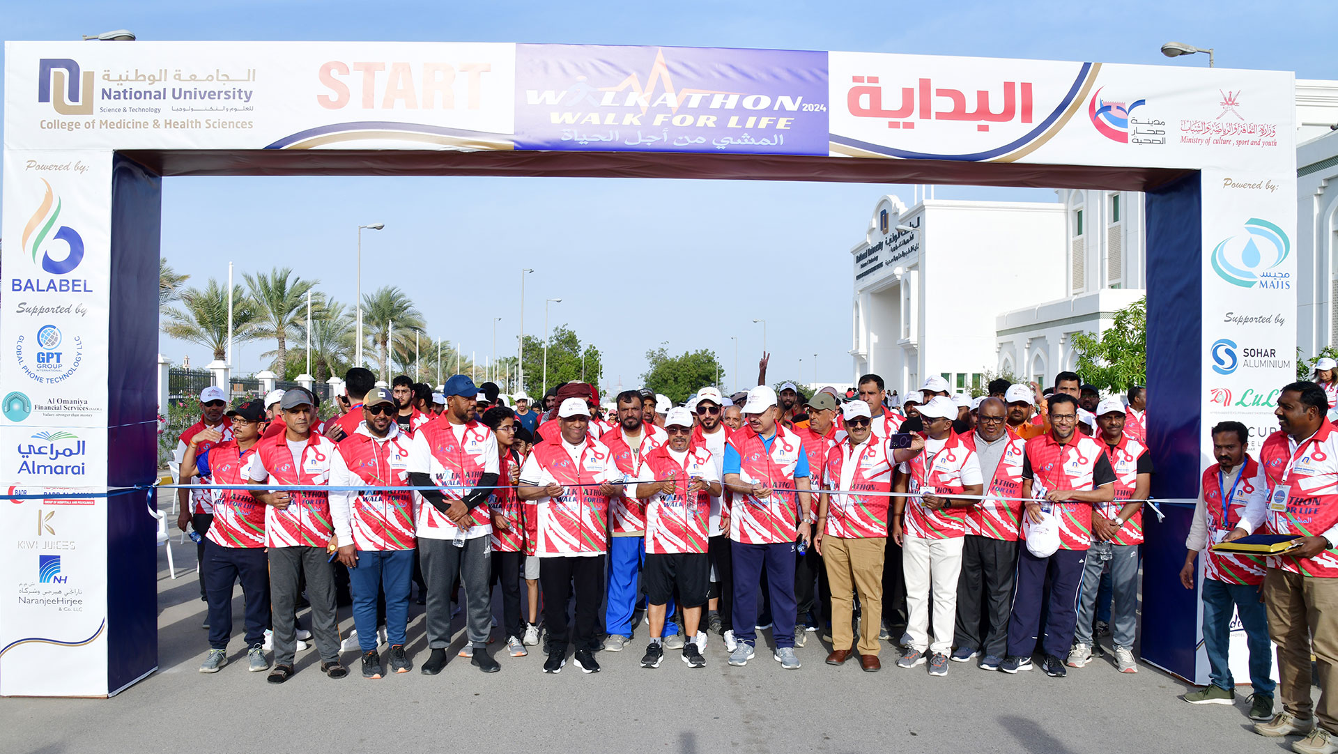 تحت رعاية ومشاركة المكرم الدكتور علي بن سعود البيماني رئيس الجامعة الوطنية للعلوم والتكنولوجيا انطلقت النسخة الأولى من مسير كلية الطب والعلوم الصحية تحت شعار ” المشي من أجل الحياة” وذلك يوم الاثنين الموافق ٥ فبراير ۲۰۲٤م من أمام مبنى كلية الطب بصحار. شارك في هذا المسير بالإضافة الى طلاب الكلية وموظفوها قطاعات تعليمية متمثلة في كلية العلوم الصحية والكلية البحرية وجامعة صحار والمدارس الخاصة. كذلك كانت هناك مشاركة فعالة من موظفي الشركات الصناعية بالإضافة الى مجموعة من المجتمع. حيث بلغ عدد المشاركين في المسير ۷٥۰ مشاركا.