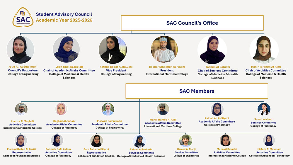 Student Advisory Council is the student body that manages student activities in the college. It is supervised by the Students Affairs Department and serves as the link between students and college administration. The elections of the student take place every academic year as per the Organizational Guide for Student Advisory Committee in Higher Education Institutions. The main Student advisory council positions are Chair/President of student advisory council, Vice president of student advisory council, activities & initiatives director, student services director, academic affairs director, and media director. Moreover, the Student Advisory Council includes in-charges of various student clubs and the class representatives of each MD year.